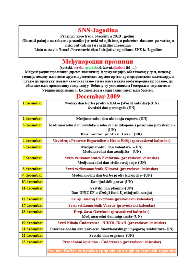 Godisnji Kalendar Vaznih Datuma