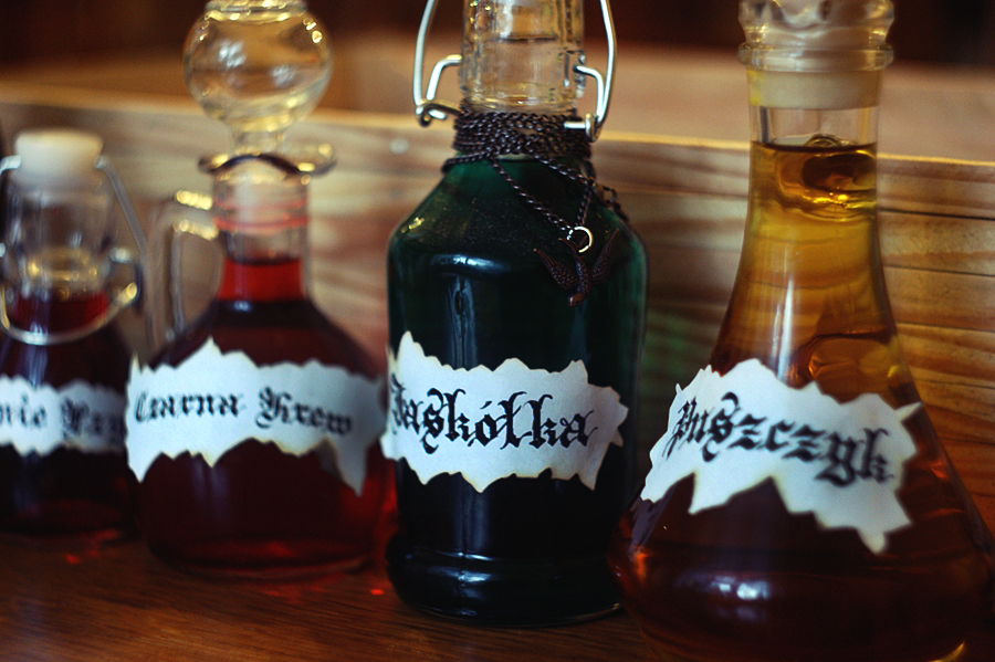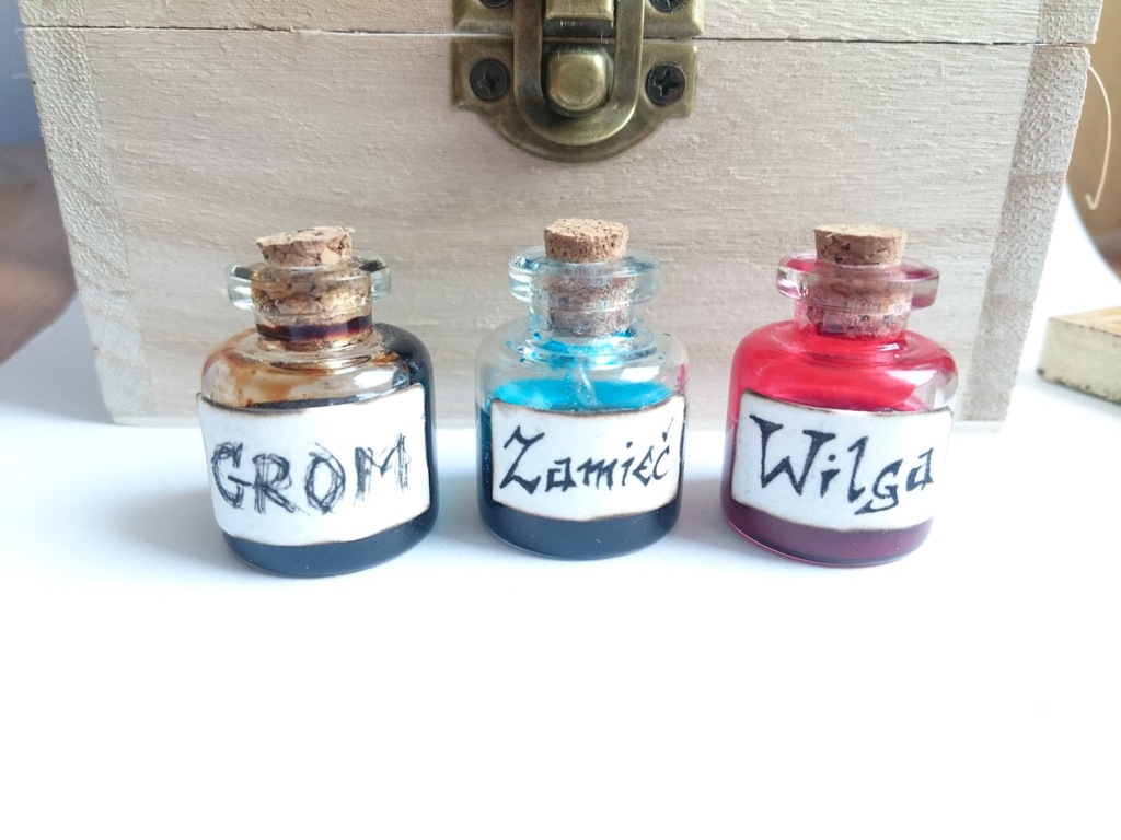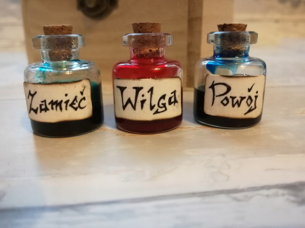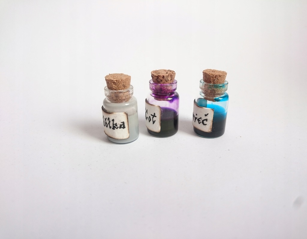 Eliksiry lub mikstury ciecze umieszczane we flakonikach.