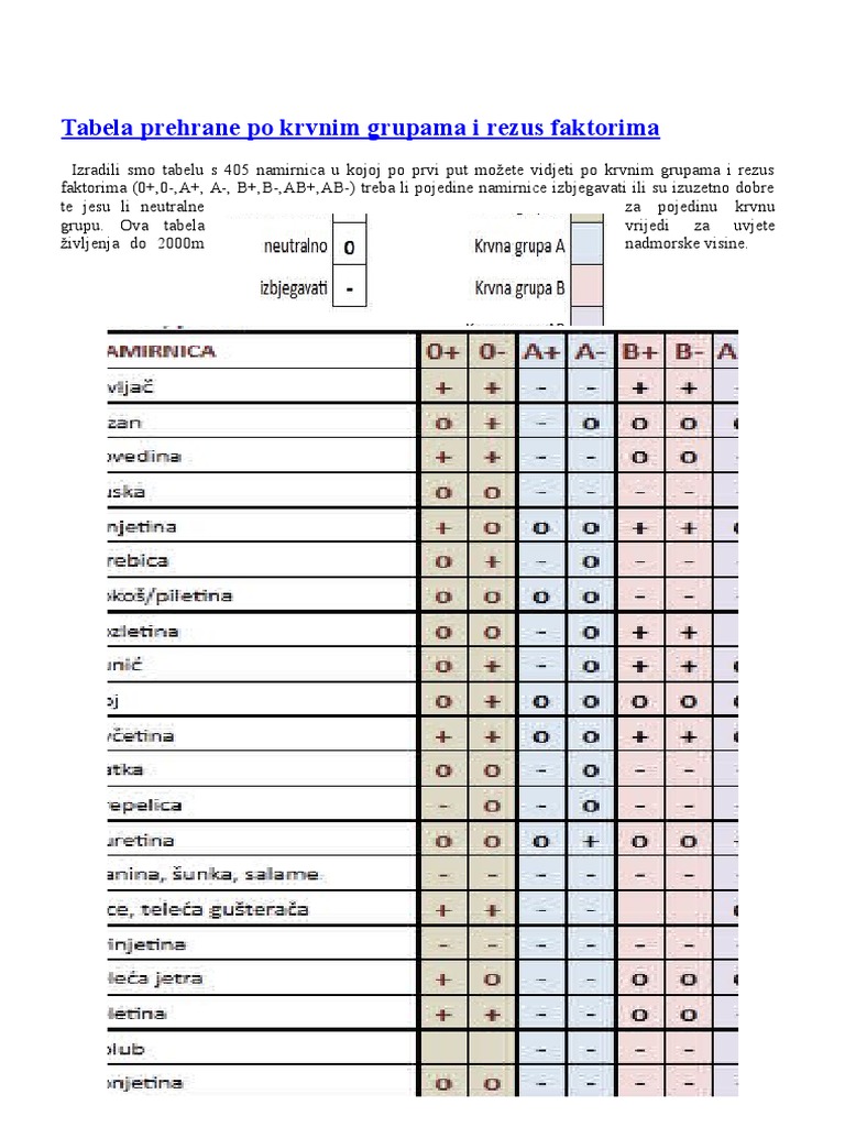 Tabela Prehrane Po Krvnim Grupama I Rezus Faktorima Docx