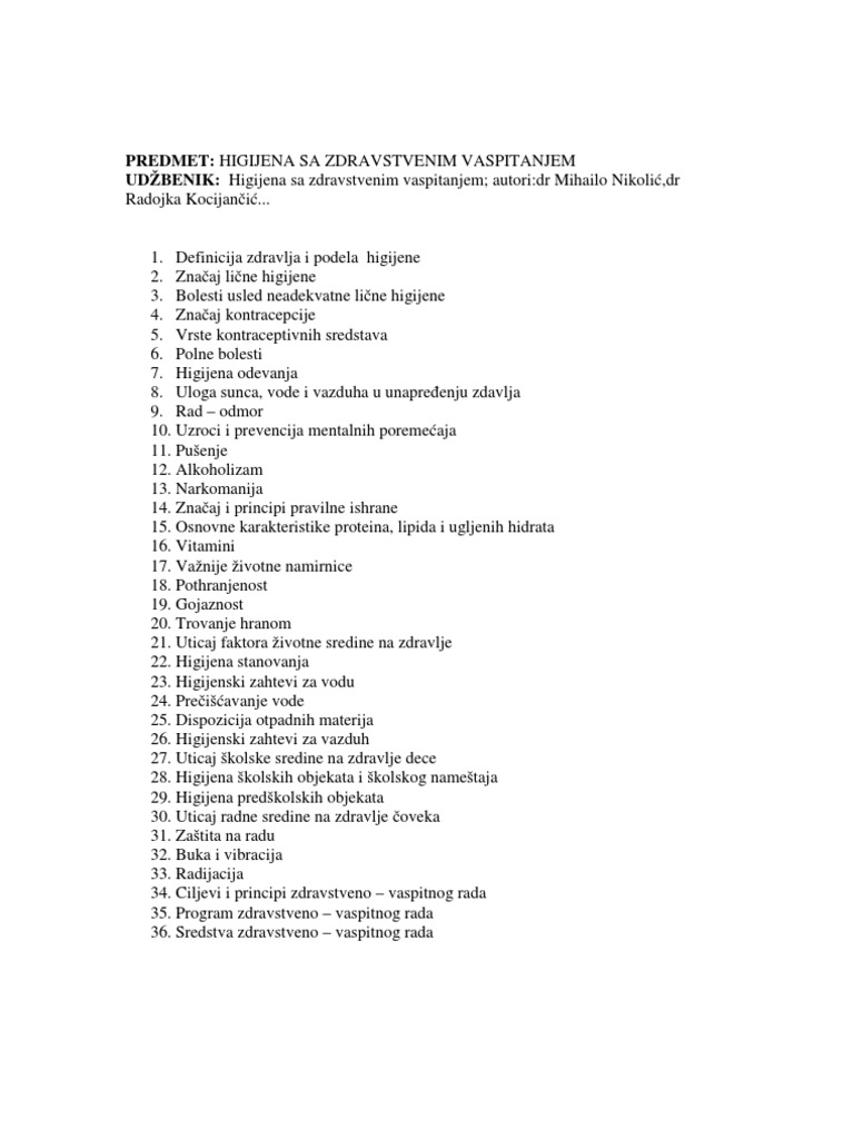 Higijena Sa Zdravstvenim Vaspitanjem Farmaceutski Tehnicar I Godina Udzbenik Higijena Sa Zdravstvenim Vaspitanjem Autori Dr Mihailo Nikolic Dr Radojka Kocijancic Pitanja